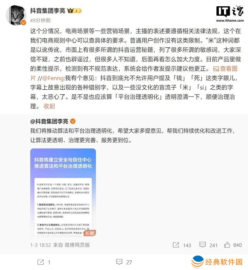 有用户指出,在抖音平台上,关于“钱”和“死”等敏感词汇的使用存在模糊地带,同时,字幕中的错别字现象也时有发生,希望平台能对此进行明确说明和有效治理。面对这些质疑,李亮在随后的回应中详细解释了抖音的立场。