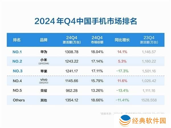 紧随华为之后的是小米,其在新机激活量上同样表现不俗,达到了1243.22万台,以微小的差距紧随华为之后,占据了17.14%的市场份额,位列第二。而苹果则以1241.17万台的新机激活量和17.11%的市场份额,屈居第三。然而,值得注意的是,苹果在这一季度的表现相较于去年同期,出现了明显的下滑,跌幅达到了17.3%。