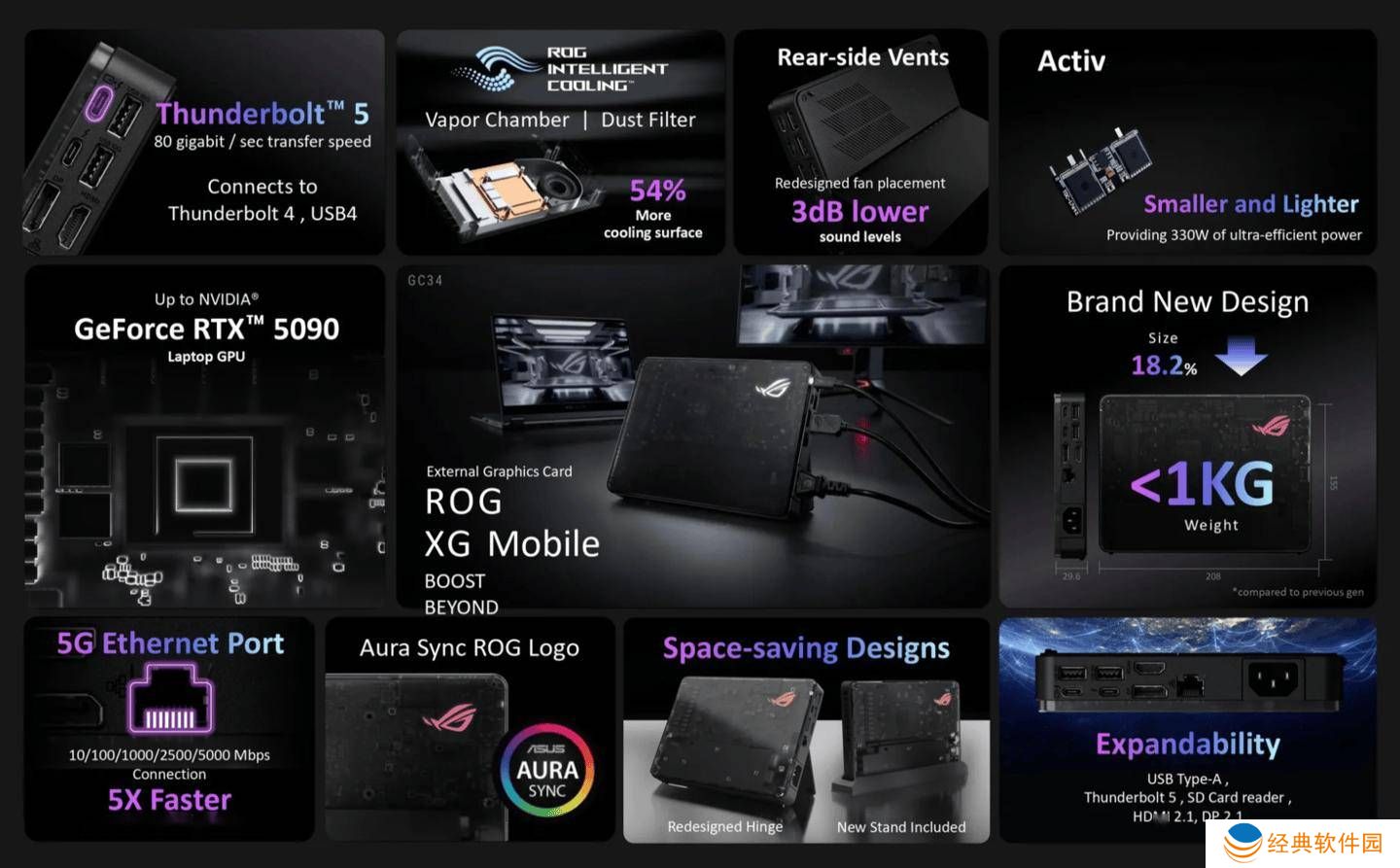 这款名为“2025 Asus XG Mobile”的扩展坞,采用了独特的黑色半透明外壳设计,不仅外观炫酷,还展示了其内部的强大配置。扩展坞内部搭载了RTX 5090移动GPU,支持高达140W的功率,为用户提供了极致的游戏和图形处理体验。