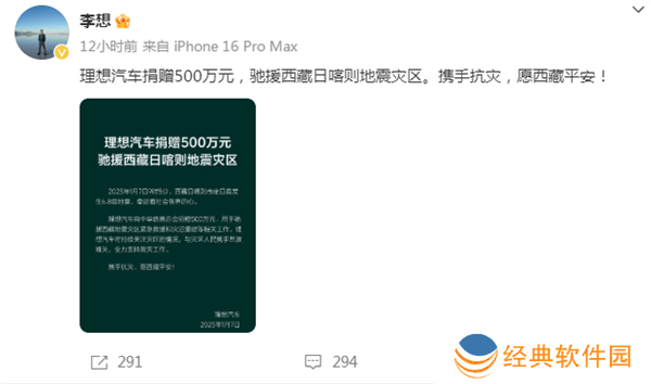 李想在微博中写道:“愿西藏平安!我们携手抗灾,共渡难关。”随文,他宣布理想汽车将捐赠500万元,这笔善款将直接用于西藏日喀则地震灾区的救援和重建工作。