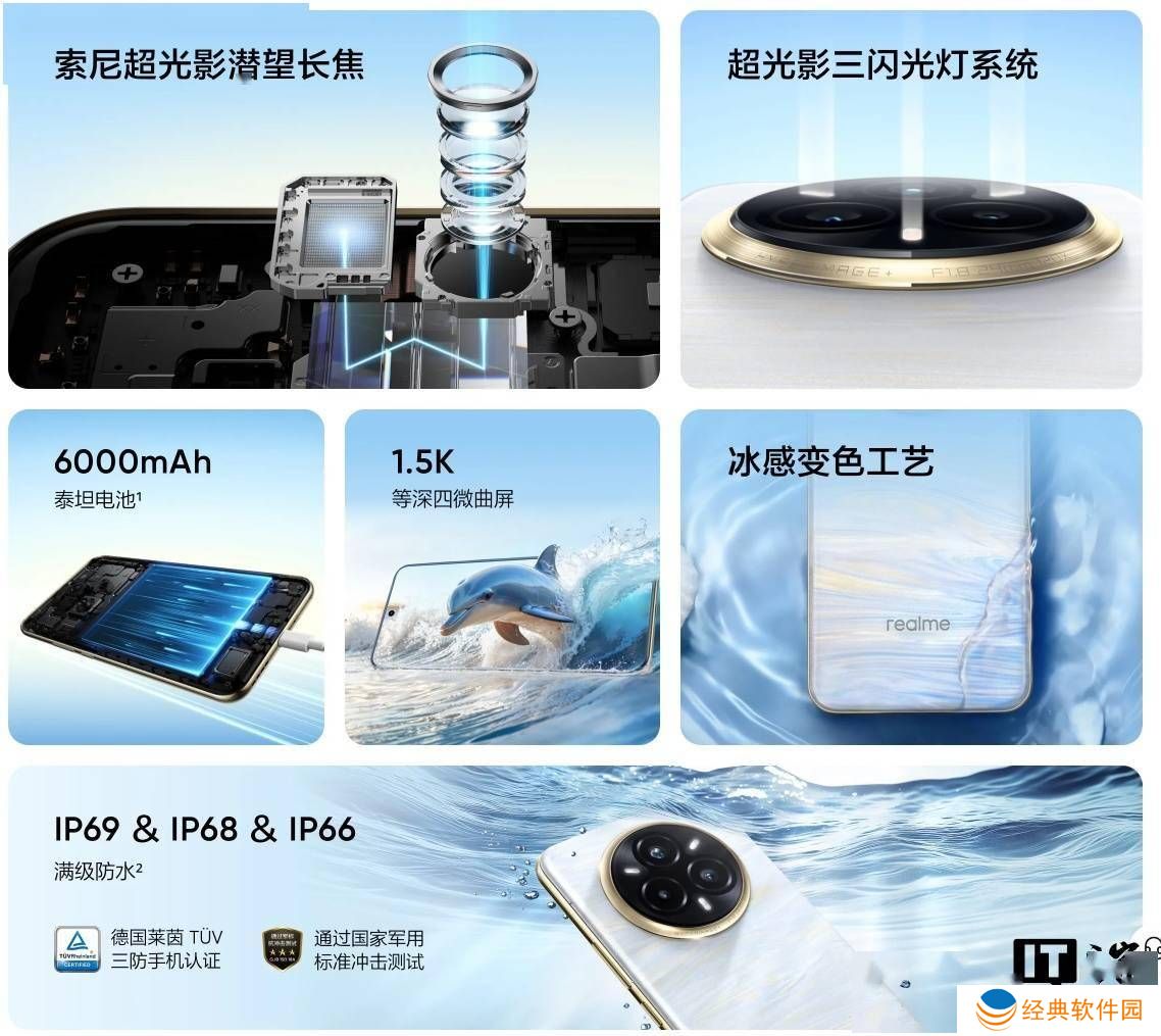 性能方面,真我14 Pro+搭载了骁龙7s Gen 3处理器,采用台积电4nm工艺制造,能够流畅运行国民级的MOBA类手游,并支持120FPS的高帧率。续航方面,该机配备了6000mAh的泰坦电池,支持80W的快充技术,让用户无需频繁充电即可享受长时间的使用体验。真我14 Pro+还具备IP69、IP68、IP66的满级防水性能,为用户的使用提供了更多的安全保障。