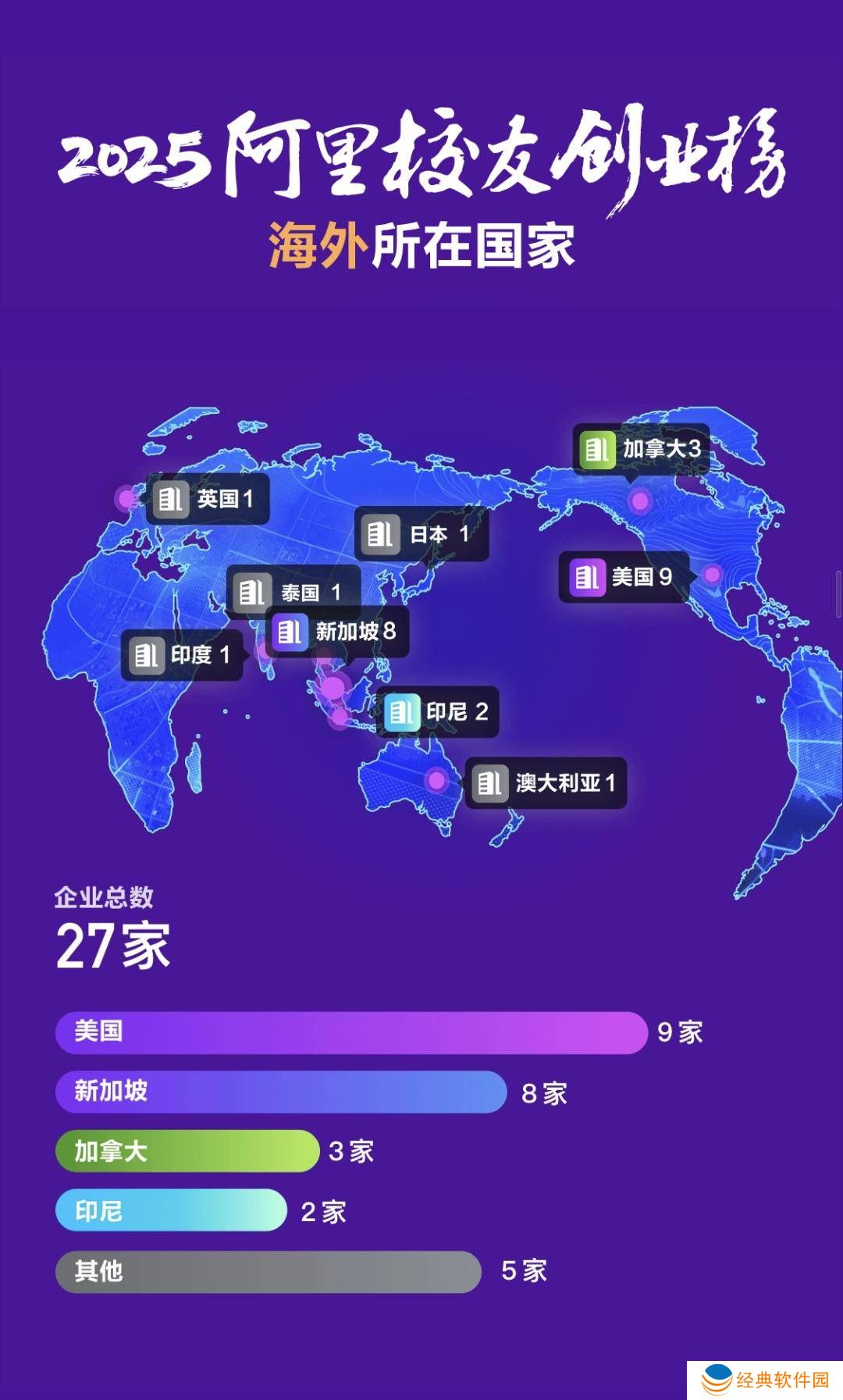更令人欣喜的是,阿里校友的创业足迹已经跨越国界,在全球范围内落地生根。在统计到的27家海外创业企业中,美国和新加坡分别占据了9家和8家,成为阿里校友海外创业的重要基地。加拿大、印尼、日本、泰国、英国、澳大利亚、印度等国也分布着阿里校友的奋斗足迹。