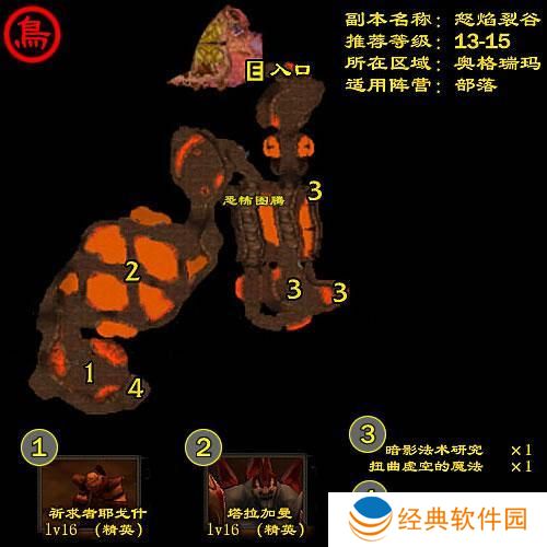 入口:从奥格瑞玛的暗影区一扇泛光的大门进入即可找到怒焰裂谷的入口。