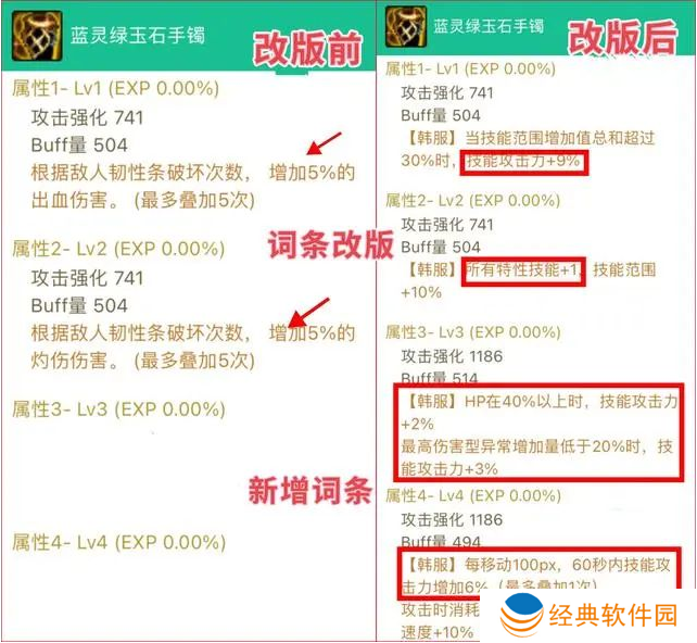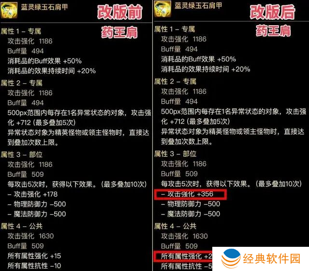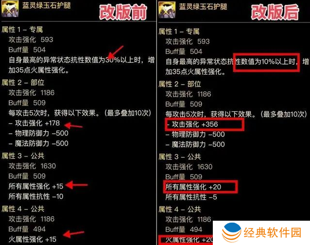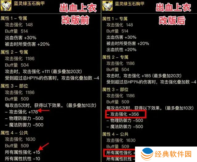 专属词条“自身异抗超过30%,属强增加35”,改版为“异抗10%增加35属强”,可以无脑触发了,直伤流可构建【全15、单15、单35、小攻强】的完美组合,改版后可完美。