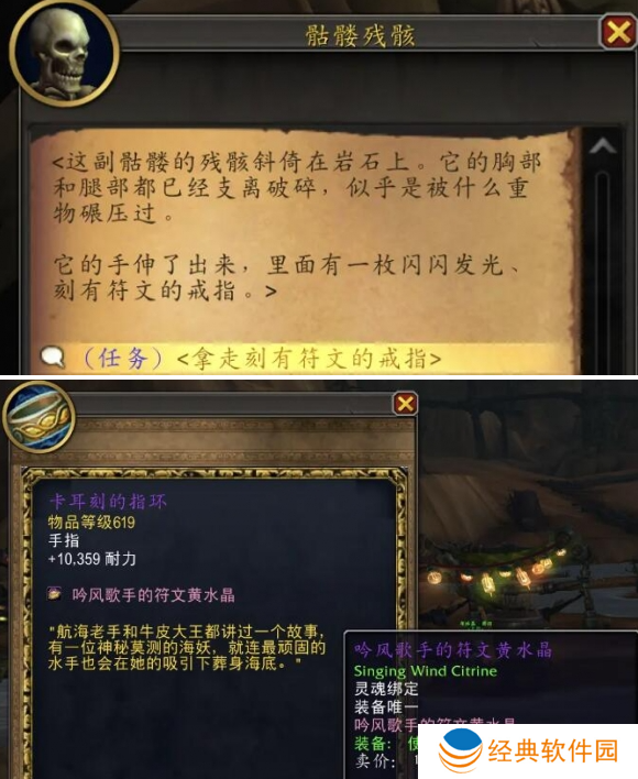 4、进入古墓的最深处有一个坐在地上的骷髅残骸,与其对话拿走戒指再把后续任务做完即可获得【卡耳刻的指环】。