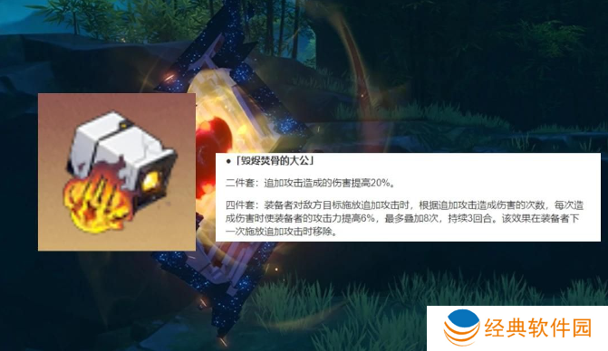 四件套:装备者对敌方目标施放追加攻击时,根据追加攻击造成伤害的次数,每次造成伤害时使装备者的攻击力提高6%,最多叠加8次,持续3回合。该效果在装备者下一次施放追加攻击时移除。