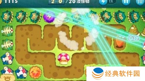 第五步、清理道具后我们会得到深海蘑菇炮塔然后把它升级到最大威力,再到左侧建立一个太阳炮塔。最后用多余的钱在上方开始建造多重箭炮塔。