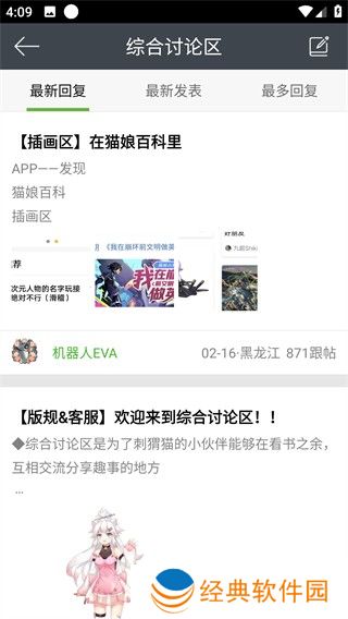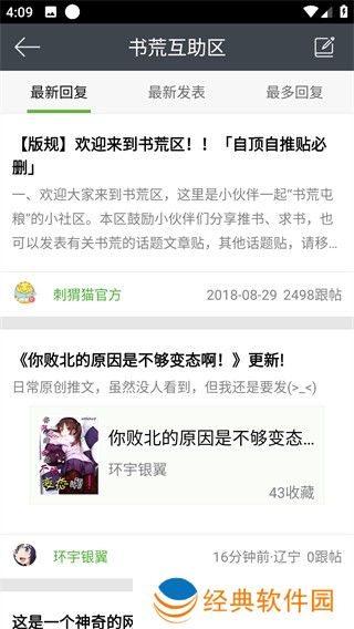 4、点击综合讨论区,会跳转一个新的社区,它是一个总小说阅读讨论区,与书评区不同,该页面覆盖了所有用户发布的讨论话题,在这里您能发现更多有趣好玩的话题或小说;
