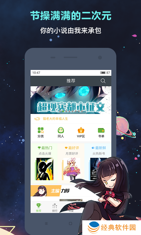 这是一款专为二次元文学爱好者打造的阅读软件,其中不仅有海量原创宅文、各式同人文、动漫穿越、异界幻想、游戏世界和超现实都市等类型的二次元小说,还有独特的画风和丰富的内容,能满足各种需求。此外,软件内置的小说弹幕功能让用户可以在阅读过程中自由讨论和吐槽,增加了阅读的乐趣。