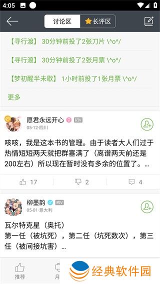3、点击书评区,然后选择具体书本的书评,点击即可进入,此页面皆为欢乐书客app用户的全新阅读体验与讨论交流,分为讨论区与长评区;