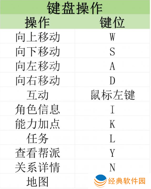 移动为WASD,奔跑左Shift,普通交互 鼠标左键,更多互动 鼠标右键,打开角**面(背包)I,打开能力界面K,打开任务界面L,打开帮派界面Y,打开关系界面N,打开地图M,暂停Esc。