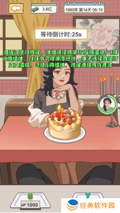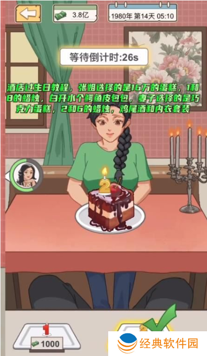 张姐选择的是16万的蛋糕,1和日的蜡烛,白开水个鳄鱼皮包包,妻子选择的是巧克力蛋糕,2和6的蜡烛,鸡尾酒和内衣套装。