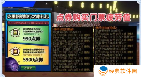 【克里帕的旅行之路礼包】售价990点券,每周限购2次,核心道具包括“10张门票、1瓶50点疲劳药、1个史诗之路宠物/光环/称号”。