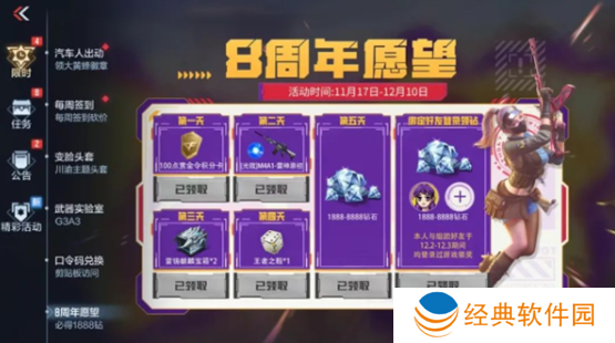 第五天的登录抽1888-8888钻石,和12月3日-12月4日与绑定好友登录抽1888-8888钻石,才是8周年愿望活动的重中之重。