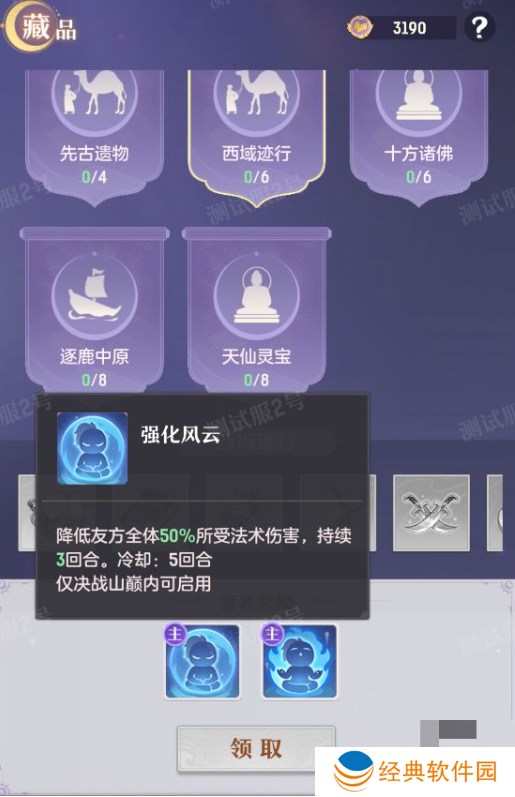 若是带有羁绊的神器聚首,更会给你带来新特技效果,除了被动可以全程触发外,主动特技只能生效一个!大家可以根据自身和队伍的打法进行抉择;比如由【逐鹿中原】八大藏品带来的加强版舍身,能无消耗复活全部队友。由【西域迹行】六大藏品带来的加强版风云之护,能降低更多受到的伤害等等。