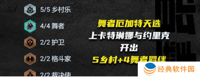 2、羁绊构成:5乡村音乐 4舞者 2护卫 2格斗家 2裁决使;