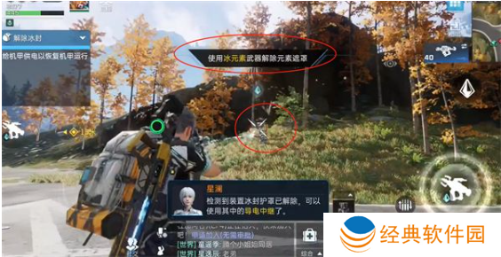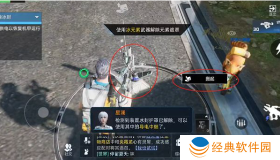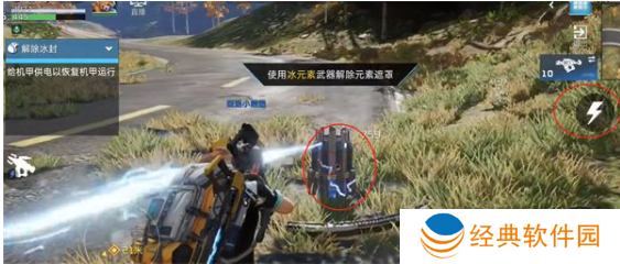 1、首先玩家需要将武器换上冰元素,用冰元素武器把发电装置解开,然后再解开两个传电器。