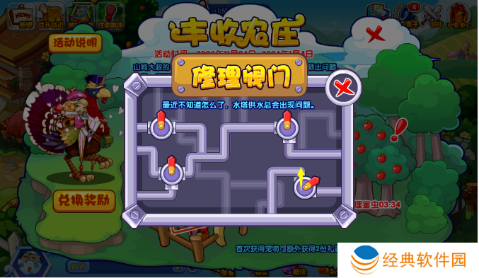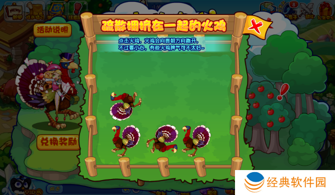将围栏内拥挤的火鸡进行疏散即可,火鸡会自动朝面向方向跑开,点击错误系统会提示,这个没啥难度,但是如果火鸡暴走,就会触发与特坑进行挑战,战胜即可。