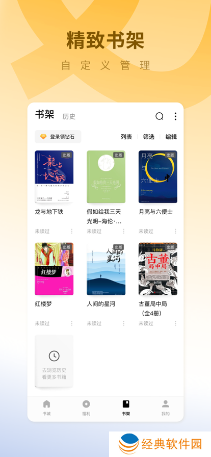 2.云书架书籍阅读记录云端同步,连载书籍章节快速更新,还有多套惊艳的书架皮肤供你选择。