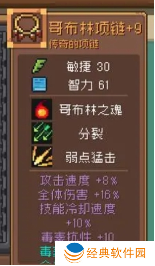 哥布林项链:再给大家推荐的这个项链也同样是传奇品质,它的基础属性也是敏捷和智力,是一件典型的法系装备,不过需要注意的是该项链属于哥布林系列的装备,所以对于融合了元素职业的射手来说也同样适合。