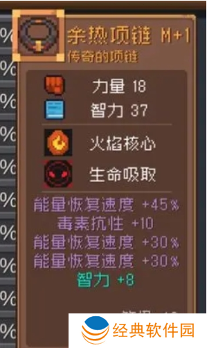 余热项链:这是一个传奇品质的项链,其基础属性中的力量与智力都达到了不错的水准,当然,它最令人看好的还是其技能,火焰核心可以让你在火焰元素层面获取更强的抵御能力和伤害输出能力,另外生命吸取也可以充分提升角色的续航,而且它可以强化多次以此来获取多个属性词条,这些词条如果能够刷到上图所示的能量恢复速度和智力,那么它的续航和输出作用都将被进一步放大。