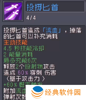 1、投掷匕首对敌人造成流血伤害,掉落的匕首可补充消耗。