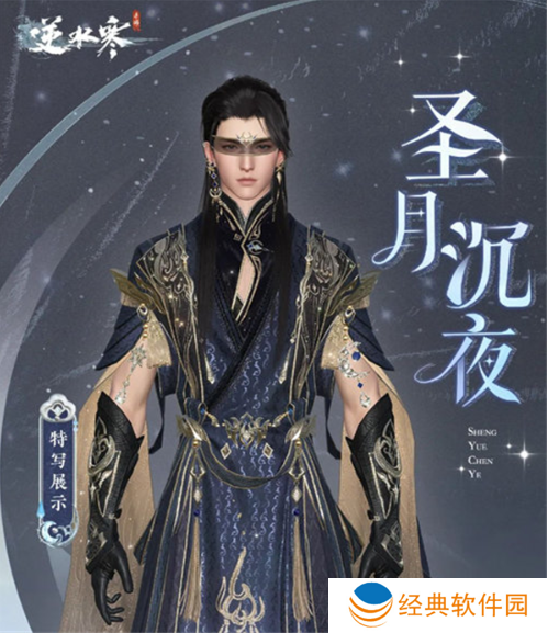 2、男性角色的圣月沉夜时装主要以蓝黑色为主,搭配金色线条点缀,给人观看夜晚星空的感觉。