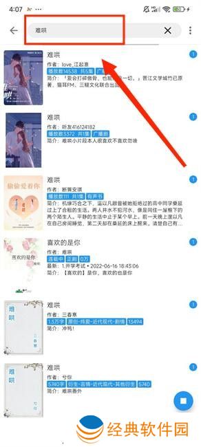 4、有一个自定义搜索栏,您可以在其中搜索关键字,并会弹出一系列相应的小说。好的小说也可以和朋友分享一起观看。