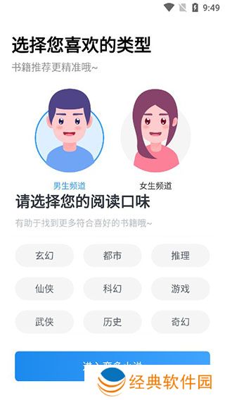 蛮多小说旧版本使用教程1、在本站下载安装蛮多小说app,首次进入需要选择性别和喜欢的类型;