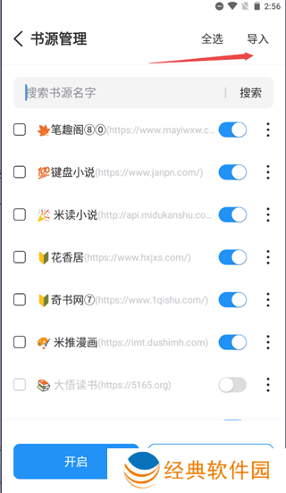 3、跳转到书源管理页面后点击右上方的导入按钮。