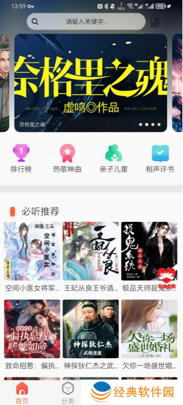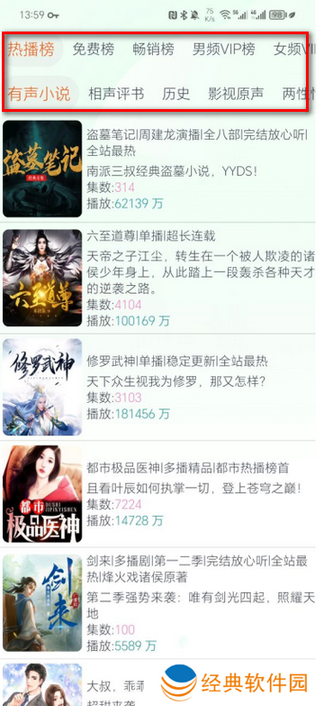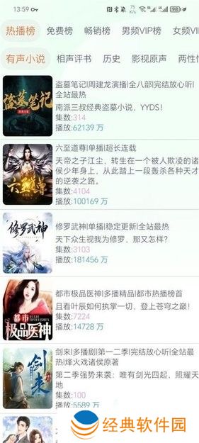 3、在听书排行榜可以看到各种有声小说,历史等内容。