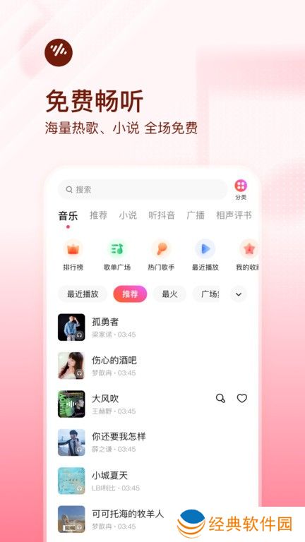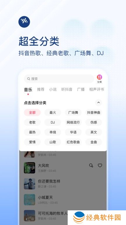 1.超全分类:热门歌曲、经典老歌、方块舞、中国流行DJ、轻音乐、童谣等各类歌曲一应俱全。