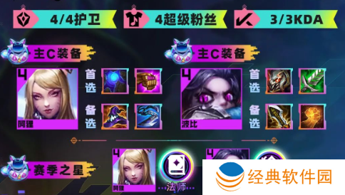 是一套以4费卡为主C和主坦的运营阵容,建议前期以连胜运营过渡为主。前期尽量以3超粉+任意法师开出3超级粉丝3KDA卡牌打工运营过渡。