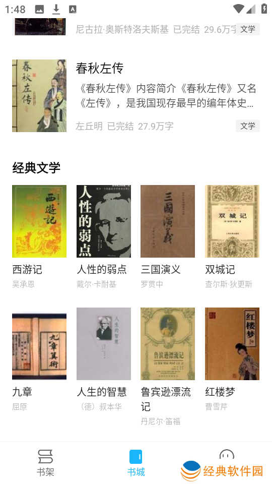 2、接着点击下方的“书城”,我们可以看到海量丰富的经典名著以及经典文学内容。