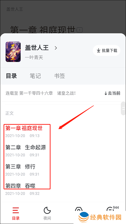 5、同时在下方我们还能够看见“批量下载章节”,我们可以点击来缓存该篇小说的章节,这样就算是离线也是能够阅读小说。