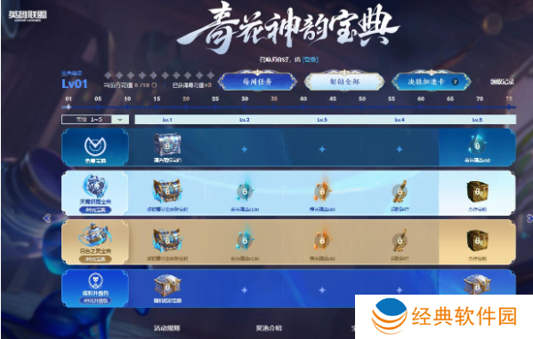 完成任务提升宝典等级,共计可获得1个【随机皮肤宝箱】(优先奖池内未解锁),1个随机图标宝箱(优先奖池内未解锁图标),1个杰作宝箱与若干钥匙碎片和蓝色精萃。