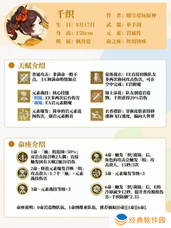 原神千织武器圣遗物怎么选择?队伍怎么搭配?原神千织是4.5版本中新出的角色,属于岩属性,使用单手剑武器,很多玩家在4.5更新后都抽取到了她,但是具体该如何玩,武器和圣遗物怎么选择,队伍怎么搭配呢?很多人估计还没有完全摸清楚千织的具体玩法,小编今天就给大家带来千织的最全面攻略,快来一起看看吧!