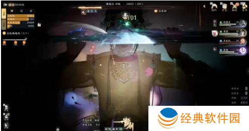 梅超风的第一个难点,她一定会点名奶妈来对周围造成伤害。目前侠侍AI不会自动远离大团,除非玩家自己玩奶妈角色,否则这里只能交治疗侠侍大招硬抗,要求不减员就好。