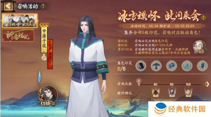 当大人选择限定联动角色SSR申屠子夜为定向角色时,使用神秘的符咒、勾玉、现世符咒进行召唤时有1%概率获得「申屠子夜印花」,集齐对应5枚申屠子夜印花即可契约召唤限定SSR申屠子夜。