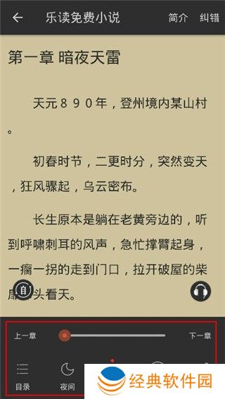 3、点击屏幕即可呼出菜单,可以在目录跳到自己想看的章节,夜间模式以及一键听书。