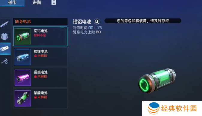 30级之后我们可以去做电池,电池的材料清单可以根据配方来搬,前期主要就是猛钢和陶瓷。