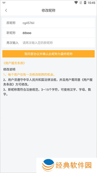 5、进入修改昵称界面后,输入新的昵称,点击同意协议,完成昵称修改;