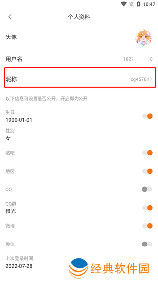 4、进入个人资料界面后,点击页面中的昵称菜单;