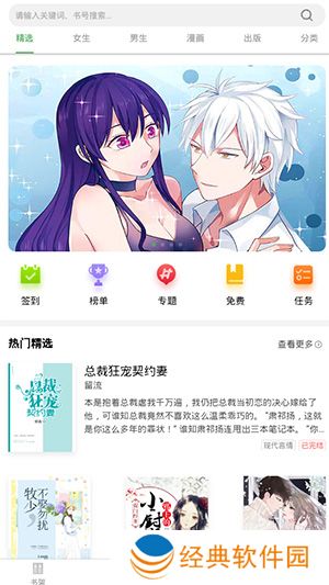 3、点开书城,有精选、女生、男生、漫画、出版等;