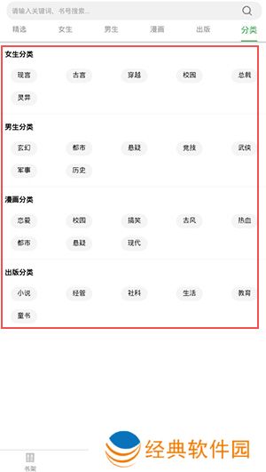 4、点开分类,有玄幻、现言、古言、穿越、校园、总裁等多种类型;