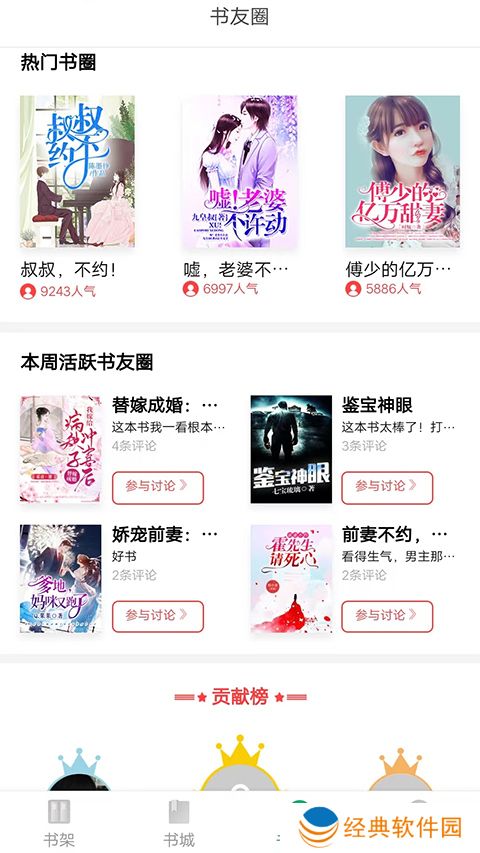 书丛使用教程1、在本站下载安装书丛app,可以看到有书架、书城、书友圈、我的四个板块;