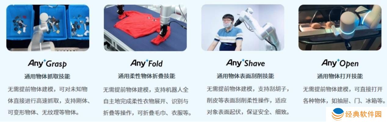 在产品方面,穹彻智能不仅提供软硬一体的大脑系统,还推出了AnySkill通用技能系列产品,包括抓取、柔性物体折叠、刮削和打开四大技能。今年7月的世界人工智能大会上,穹彻智能展示了其真机在开放环境下完成多项任务的能力,包括地面清洁、桌面整理、柔性物体操作和食材处理等。