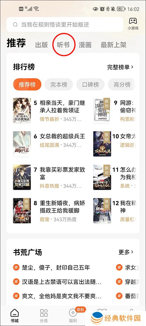 番茄小说怎么听书1、首先打开app进入到首页,在搜索栏下分排版中就有听书功能。