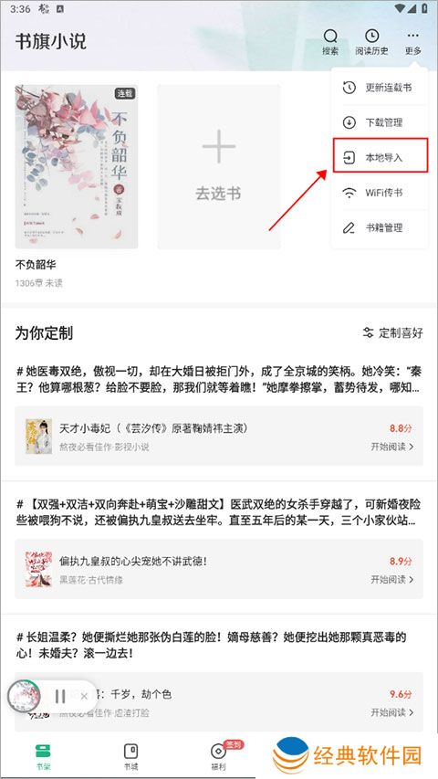 书旗小说怎么导入本地小说1、想到导入自己的下载的小说非常简单,只需要在首页点击右上角的“更多”,选择“本地导入”
