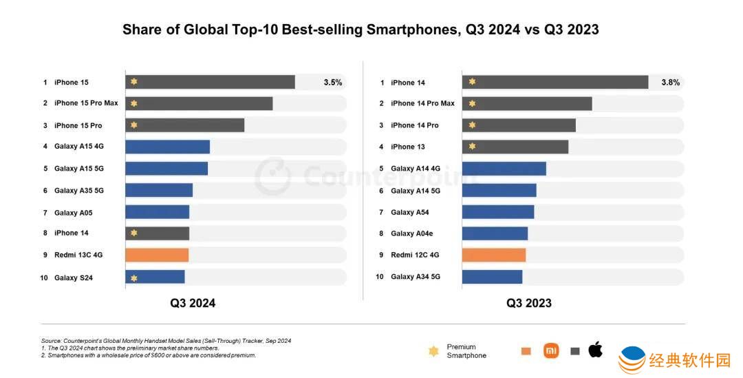 在具体机型方面,iPhone 15凭借其出色的市场表现,成为该季度全球销量最高的智能手机。三星Galaxy S24也表现出色,连续三个季度销量跻身前十,这是自2018年以来,Galaxy S系列首次在第三季度进入销量前十名,显示出三星在高端市场的复苏势头。